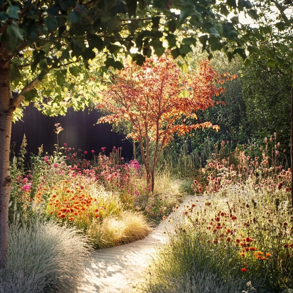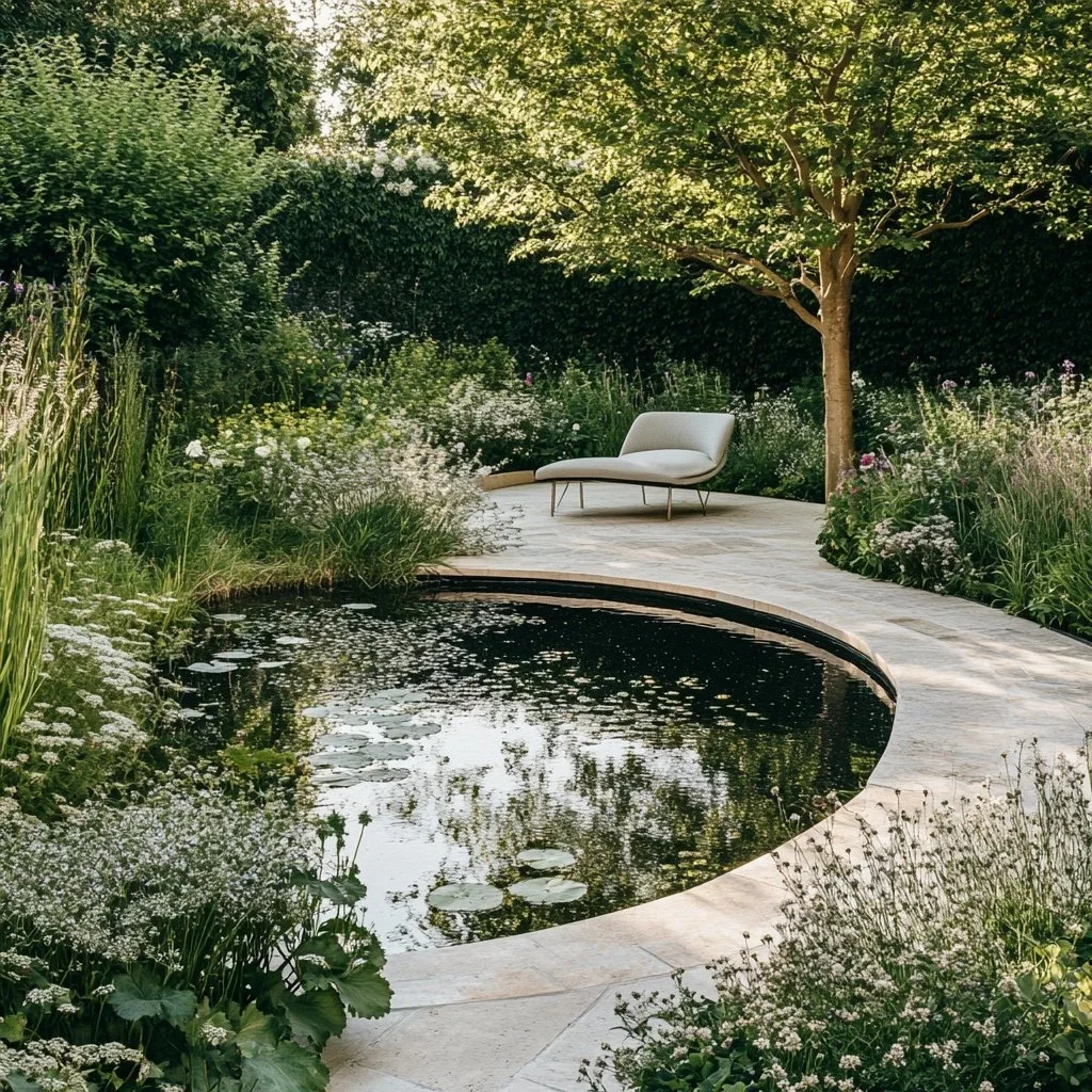 The journey starts with ‘Reflection and Contemplation’ – a soothing space designed to give comfort and clarity. It provides a sanctuary – cocooned by greenery – with a reflective pool and grounding evergreen planting. The path continues through an avenue of silver birches underplanted with white woodland style planting inviting contemplation and connection with the natural world. A more open area for ‘Realising and Releasing Anger’ includes naturalistic perennial planting with dynamic sweeps and seasonal waves of hot colour, before moving into a space of ‘Gratitude and Serenity’. This is a tranquil and calming part of the garden – intended to evoke nature and the spirit of the local landscape with a wildflower meadow, orchard and wildlife pond.